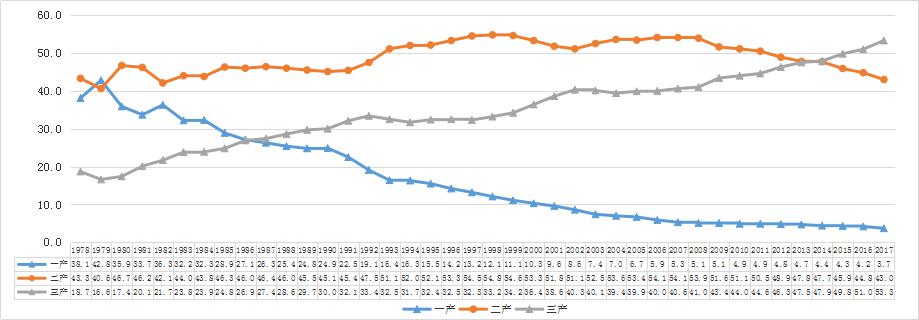 圖3 ???1978-2017年浙江省三次產業占GDP比重(%)
