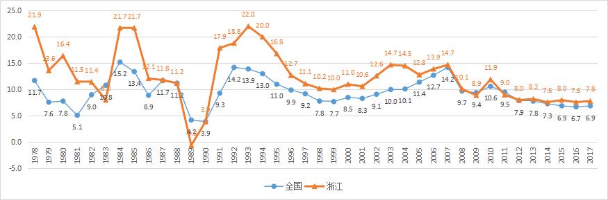 圖2 ???1978-2017年全國及浙江GDP增速(%)