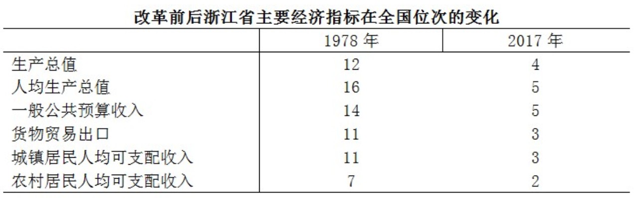 改革開放40年來,浙江走出了一條富有特色、較為成功的發展道路。在這片陸域面積不大、山區居多、資源短缺、基礎較弱的土地上,創造出令人矚目的“奇跡”,經濟總量、居民收入等主要指標大幅躍升并穩居全國前列,國際地位和影響力不斷提升。