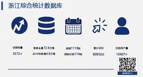 1.強化統計數據庫建設。2019年,浙江綜合統計數據庫和“數據浙江”移動客戶端重新改版為“數據浙江”網頁版和移動版,實現了省、市、縣三級統計數據庫共用共享,有效地統籌統計資源,實現統計數據的指標化管理和數據共享,提高統計數據管理的效率,拓展了網頁平臺和移動端自定義查詢、專題查詢、整表查詢等多種展現方式的數據展示功能,并增加了數據解讀欄目,展示最新的統計分析和統計信息,數文并茂,美化了展示頁面,并且通過利用大數據分析思維,實現移動端智能化推送。2019年,“數據浙江”總數據量已達72.9萬筆,其中今年新增4.9萬筆,總發布量57.2萬筆,報表1119張,統計指標3572個,指標分組114組,系統注冊用戶量13407個,累計訪問量80952次。