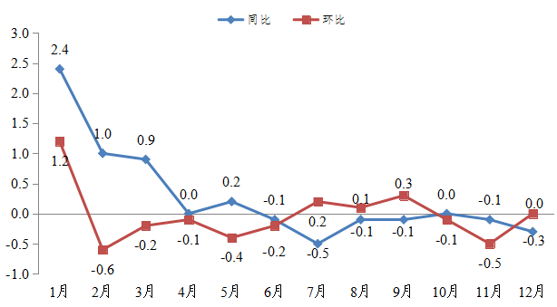全年居民消費價格比上年上漲0.3%。其中,城市上漲0.3%,農(nóng)村上漲0.3%;消費品價格下降0.1%,服務價格上漲0.9%。工業(yè)生產(chǎn)者出廠價格下降2.7%,工業(yè)生產(chǎn)者購進價格下降5.2%。