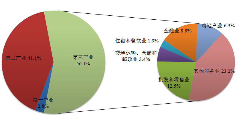 全年服務業(yè)增加值46268億元,比上年增長6.7%,增速比上年提高3.4個百分點,拉動全省生產(chǎn)總值增長3.8個百分點,對經(jīng)濟增長的貢獻率為63.2%。住宿和餐飲業(yè)、信息傳輸軟件和信息技術(shù)服務業(yè)、租賃和商務服務業(yè)、金融業(yè)增加值分別增長13.8%、11.5%、11.2%和9.5%。規(guī)模以上服務業(yè)[4]企業(yè)營業(yè)收入29994億元,增長6.4%;利潤總額3463億元,增長18.8%。