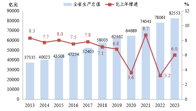 圖1 ?2013-2023年全省生產(chǎn)總值及增速