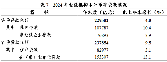 年末全部金融機構本外幣各項存款余額229502億元,比上年末增長4.0%,其中人民幣存款余額增長4.0%。住戶本外幣存款余額107787億元,增長10.4%。全部金融機構本外幣各項貸款余額237854億元,增長9.5%,其中人民幣貸款余額增長9.7%。年末主要農村金融機構(農村信用社、農村合作銀行、農村商業(yè)銀行)人民幣貸款余額37815億元,比年初增加3768億元。