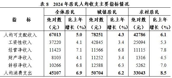 全年居民人均消費支出45107元,比上年增長6.9%,扣除價格因素實際增長6.6%。按常住地分,城鎮(zhèn)居民人均消費支出50704元,增長6.2%,農村居民人均消費支出33043元,增長8.5%,扣除價格因素實際分別增長5.9%和8.2%。