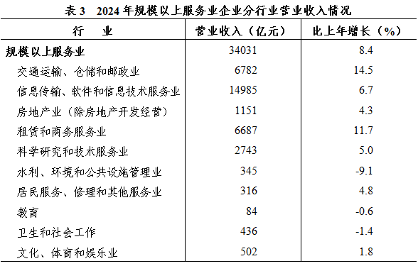 [6]規(guī)模以上服務業(yè)統計范圍包括:年營業(yè)收入2000萬元及以上的交通運輸、倉儲和郵政業(yè),信息傳輸、軟件和信息技術服務業(yè),水利、環(huán)境和公共設施管理業(yè),衛(wèi)生行業(yè)法人單位;年營業(yè)收入1000萬元及以上的房地產業(yè)(不含房地產開發(fā)經營),租賃和商務服務業(yè),科學研究和技術服務業(yè),教育行業(yè)法人單位;以及年營業(yè)收入500萬元及以上的居民服務、修理和其他服務業(yè),文化、體育和娛樂業(yè),社會工作行業(yè)法人單位。