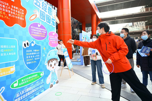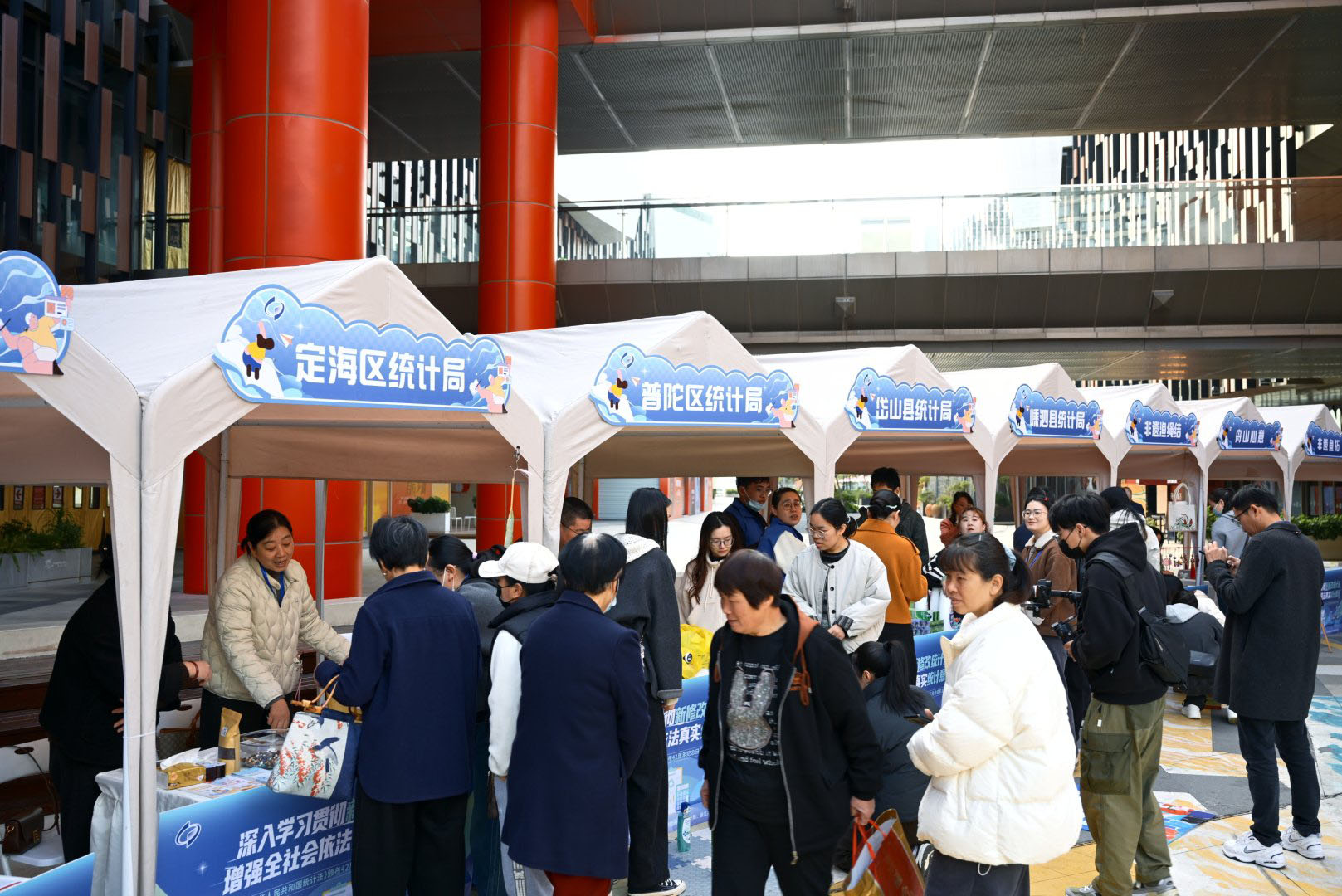 在舟山新城寶龍廣場法治嘉年華分會場,現場設置的法治主題市集,集統計知識宣傳、普查成果展示、統計法律咨詢于一體,巧妙運用生活語言、互動游戲、趣味挑戰,數百名市民在歡聲笑語中了解統計數據與民生福祉的聯系,獲取權威解讀;在沉浸式體驗中感受統計文化的魅力,深化了對統計工作的理解和認同。